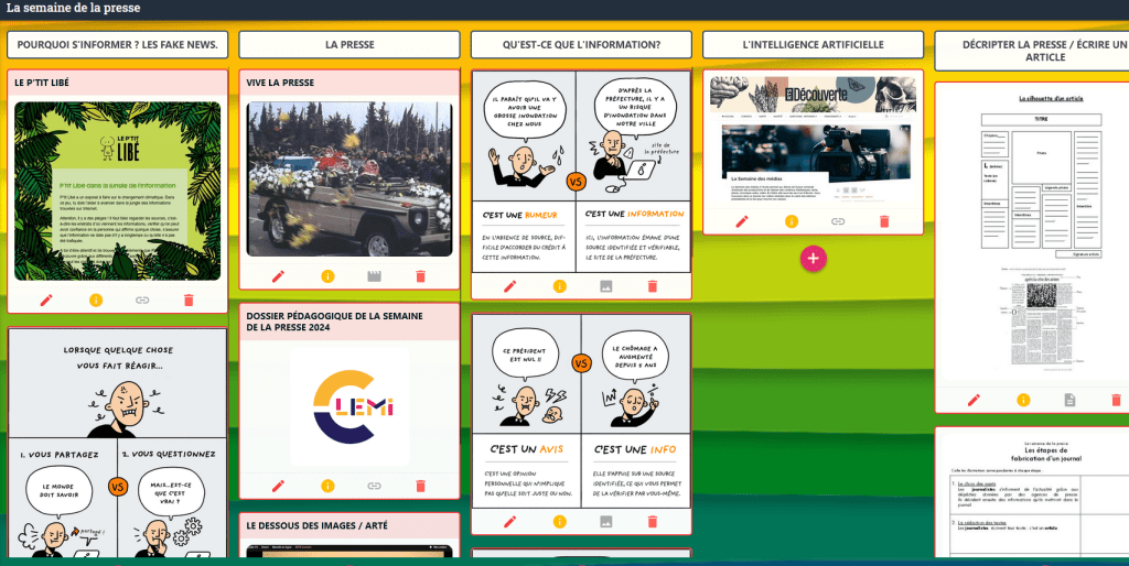 Voici un exemple de ce que j’ai pu faire avec pour la semaine de la presse : j’ai utilisé ce Digipad avec mes élèves sur mon TNI. Vous en retrouverez d’autres pour illustrer certaines de mes leçons car son utilisation est infinie…