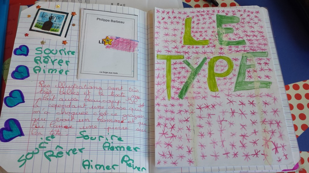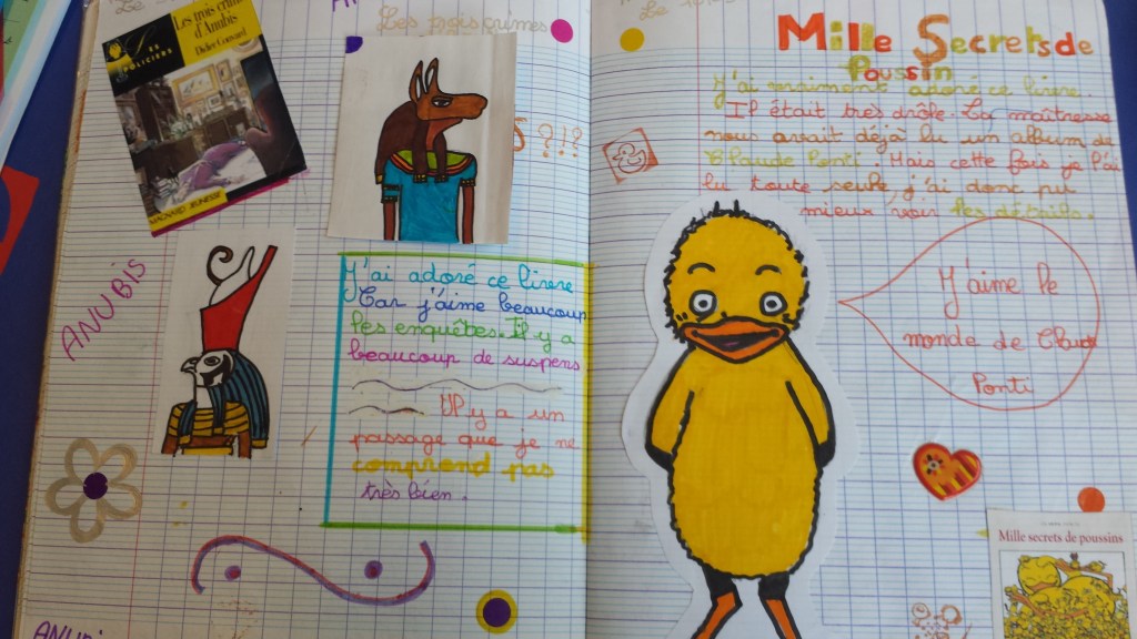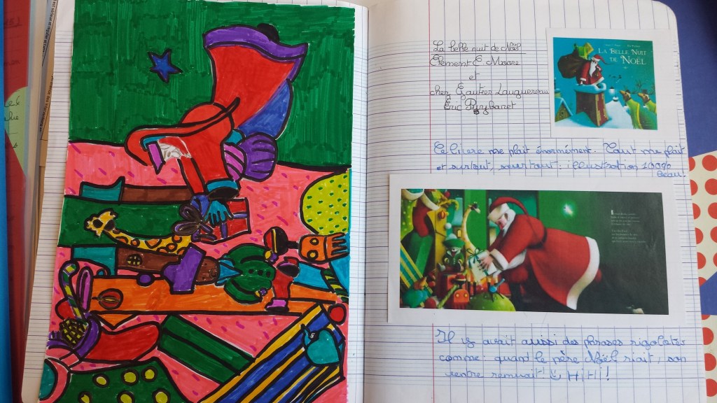 Le carnet de littérature, ne contient que le retour des lectures faites en classe par les enfants ou moi-même. Je l’ai fait réfléchir, écrire, dessiner… sur une œuvre littéraire. Cette dernière est exposée dans la classe afin qu’ils puissent l’emprunter lorsqu’ils écrivent dans le carnet.