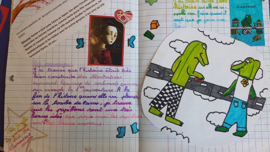 Ces photos montrent un petit échantillon des carnets de littérature ou artistiques et culturels. Depuis que j’utilise cet outil, j’ai pu constater d’énormes progrès chez tous mes élèves (y compris les plus en difficulté) qui ont énormément progressé.