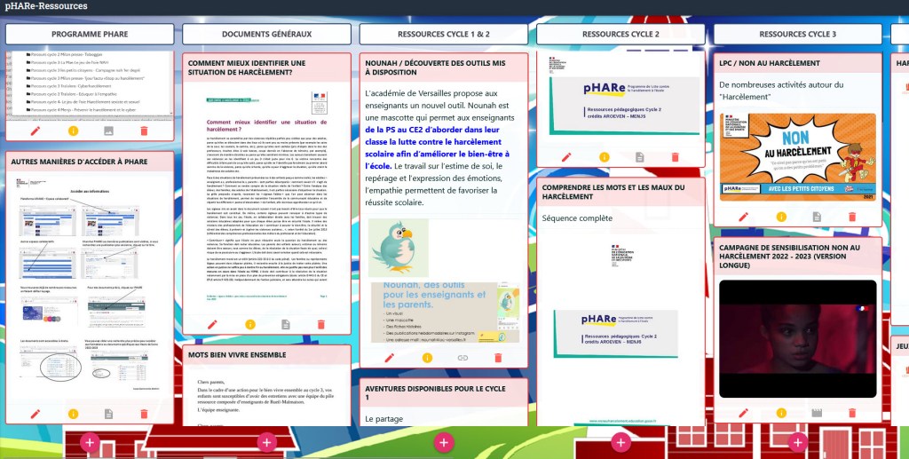 Voici un Digipad que j’ai réalisé sur le programme pHARe du cycle 1 au cycle 3. Il y a de très nombreuses ressources pouvant être utilisées tout au long de l’année, car le harcèlement ne se limite pas qu’à une journée de sensibilisation, malheureusement !