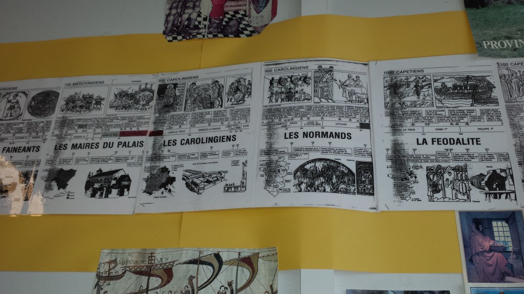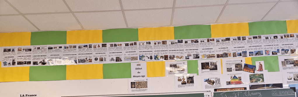 J’utilise cette frise chronologique depuis plus de 30 ans maintenant. Je l’ai trouvée dans la première classe où j’ai enseigné. Je l’ai entièrement refaite car elle n’est plus du tout éditée. Les photos permettent de voir comment la mettre en place. C’est très visuel pour les enfants et, en plus, les différentes périodes sont respectées (ce qui n’est pas du tout le cas dans celles que l’on trouve généralement).
