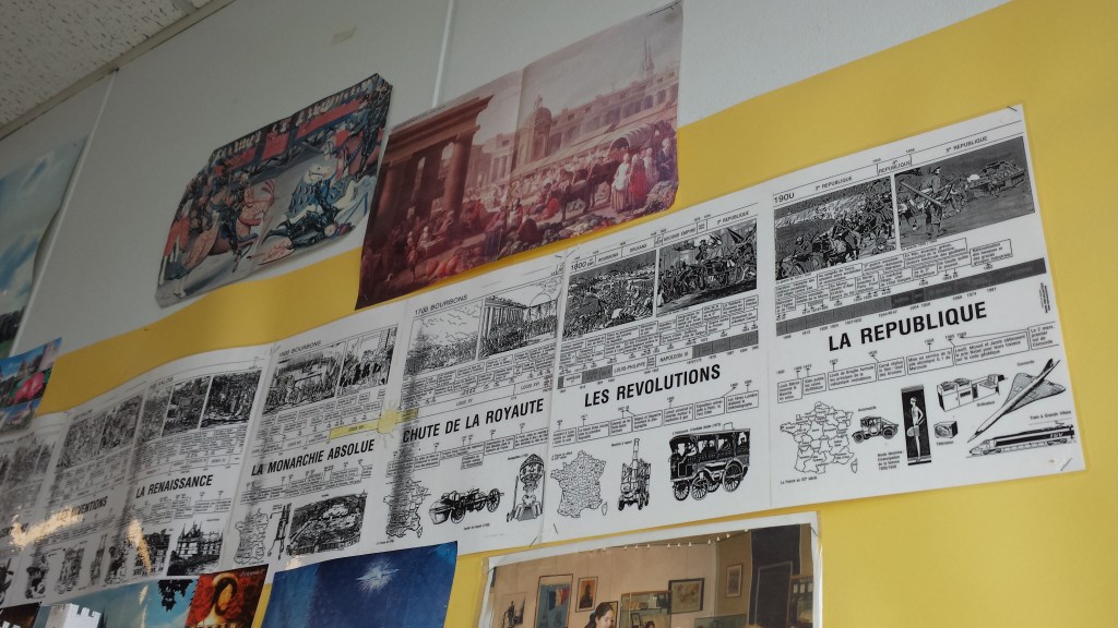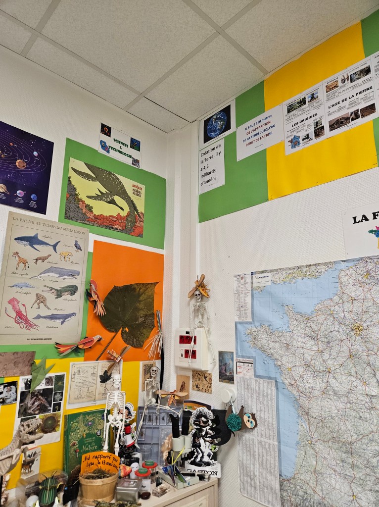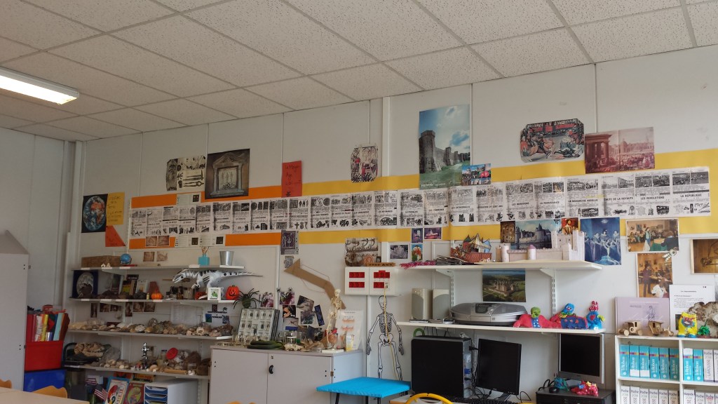 La frise est placée après le coin géographie et le coin sciences car cela me permet de faire le lien. Il faut 750 millions d’années entre l’apparition de la Terre il y a 4,5 milliards d’années et l’apparition de la vie. La photo satellite de la Terre et l’affichage aident à le comprendre.