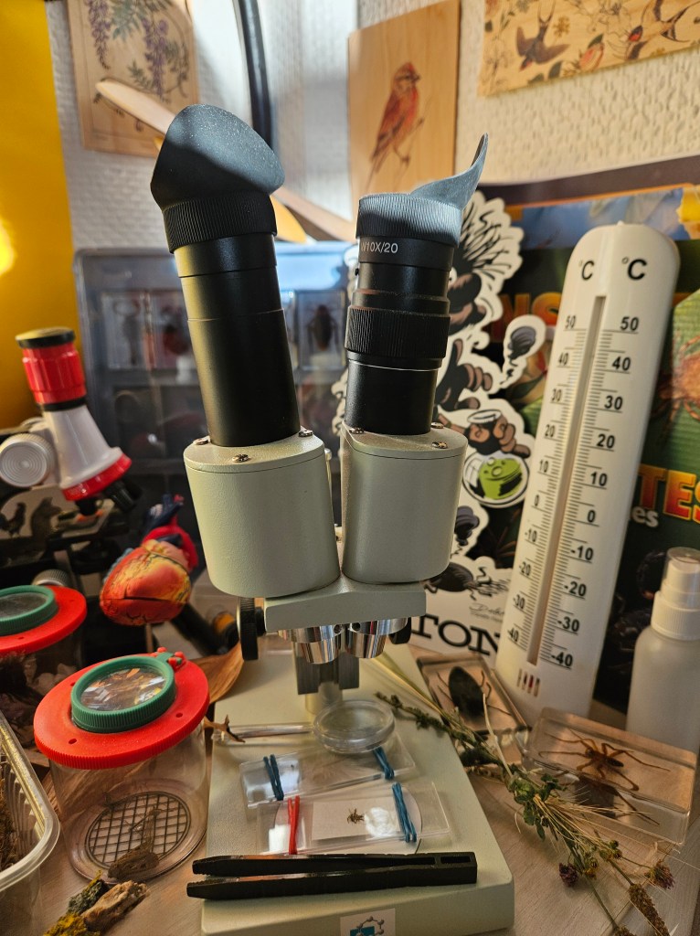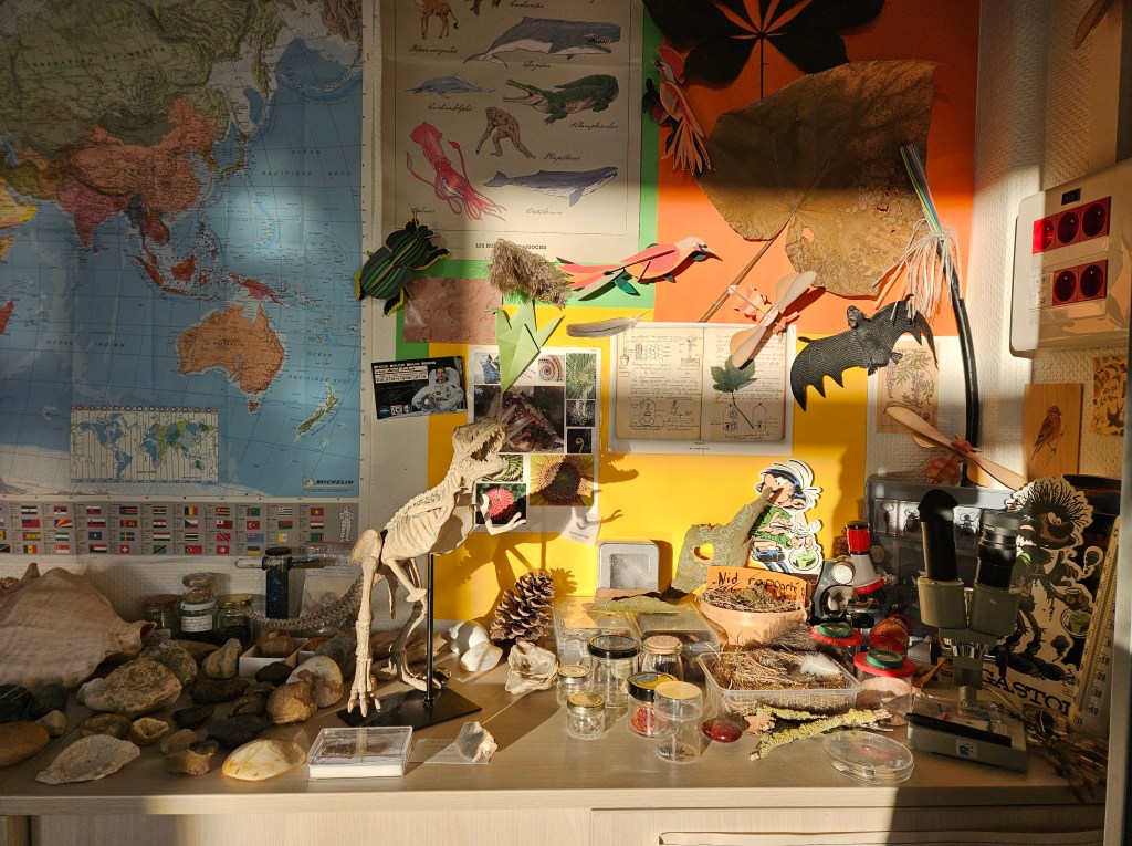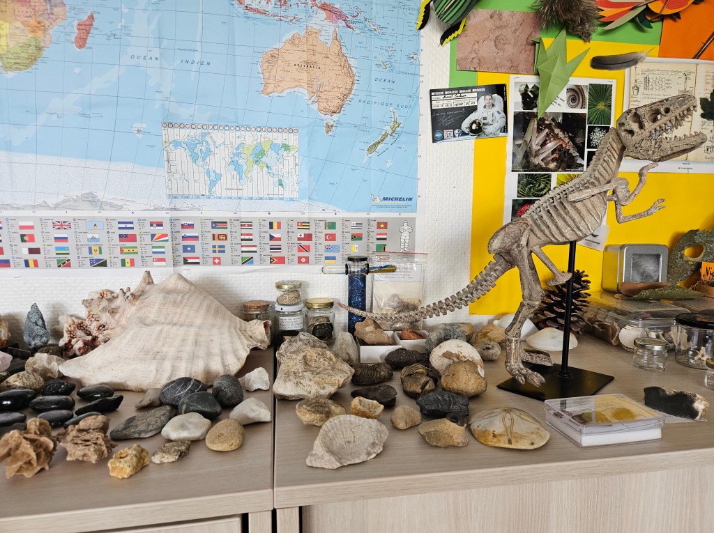 Dans la classe, j’ai réalisé un coin sciences qui permet aux enfants d’observer des pierres, des fossiles, des coquillages et autres objets scientifiques, à la manière d’un cabinet de curiosités. Ils adorent ! Chaque année, les élèves l’enrichissent. C’est le moment d’échanger sur ce qu’ils ont apportés.